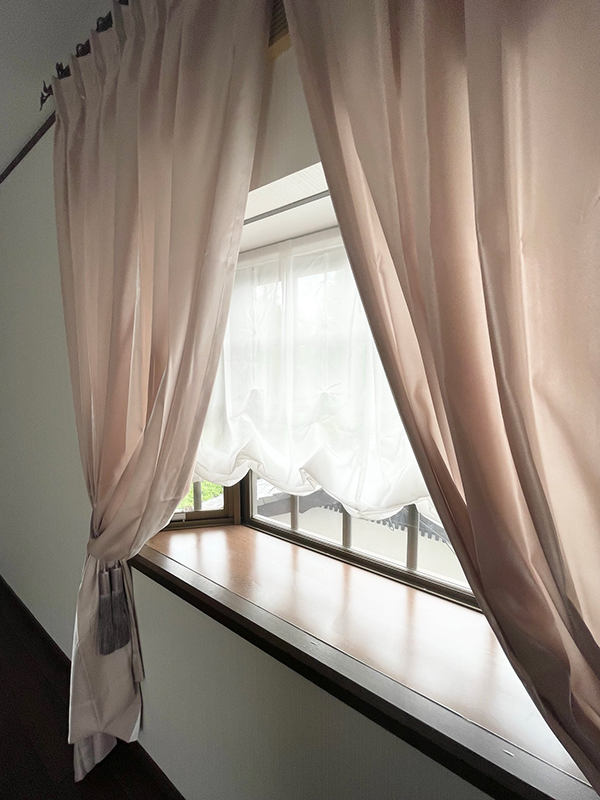 お部屋の印象を決めるカーテンには、フジエテキスタイルの「ハクボ」をチョイス。くすみピンクの上品な色味で、生地の手触りがとってもなめらか。ディズニープリンセスのドレスを思わせる美しい素材は、ドレープの美しさと、角度によってキラキラと表情を変えて輝く生地が魅力です。マナトレーディングの淡いパープルのタッセルが、くすみピンクのカーテンをより素敵に引き立て、全体をやさしくまとめています。