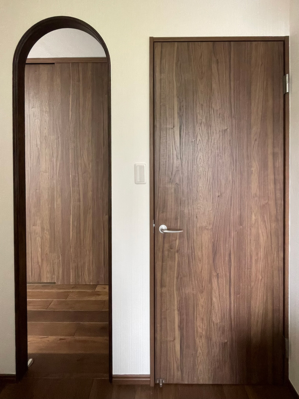 押入れとウォークインクローゼットは、使いやすさと収納量のアップを目指してリフォームしました。家事室としても快適に使えるよう、動線にもこだわっています。もともと壁だった部分にアーチ形の開口を新たに設け、寝室から直接ウォークインクローゼットへ入れるようにしました。これにより、生活動線がスムーズになり、より快適に。